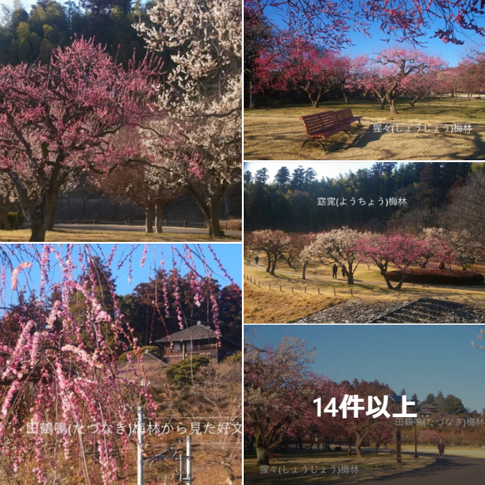 偕楽園公園拡張部の、田鶴鳴(たづなき)梅林・猩々(しょうじょう)梅林・窈窕(ようちょう)梅林。偕楽園下、四季の原への途中にある3梅林、本園より毎年開花が早く今年も今、見頃!を迎え美しい。